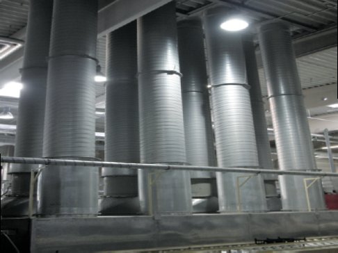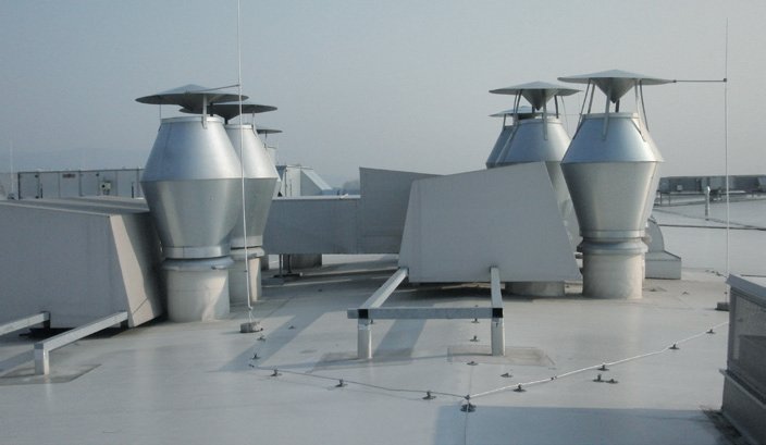 Dachlandschaft mit wetterfesten Lüftungsgeräten sowie Ansaug- und Ausblaswerken für den Industriebereich.