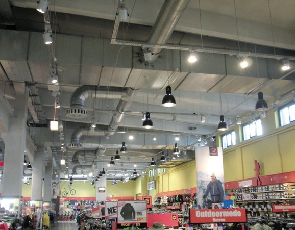 Sportartikelgeschäft: Klimatisierung der Verkaufsräume über hochinduktive verstellbare Radialauslässe für sehr große Raumhöhen.