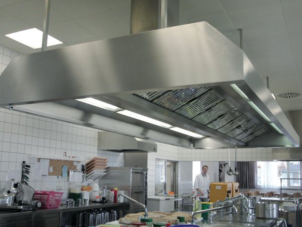 Lüftungsanlage in Großküche gemäß ÖNORM H6030: Dunstabzugshauben mit hochwirksamen Wirbelstromabschneidern.