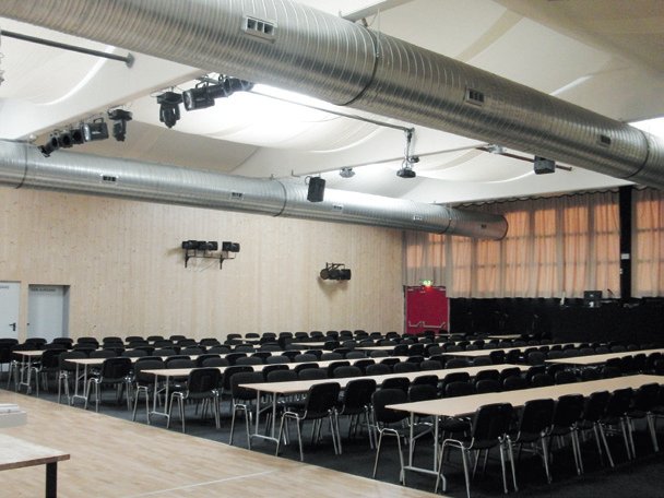 Veranstaltungssaal Wiener Neustadt: Luftheizung und Raumlüftung in Abhängigkeit der Personenanzahl. Die Ausblasung erfolgt über thermische, selbsttätig verstellbare Weitwurfauslässe.
