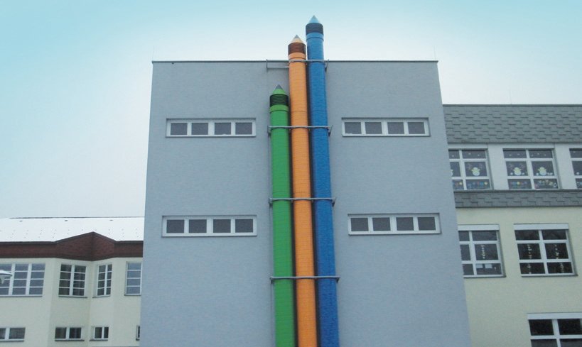 Volksschule Theresienfeld: Frischluft- und Fortluftführung für Turnsaallüftung, sowie Kaminführung des Kessels Überbau mittels pulverbeschichteter Rohre, Sonderausblasstellen in Form von bunten Bleistiftspitzen.