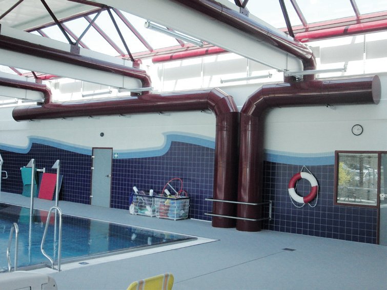 Waldschule Wiener Neustadt, Therapieschwimmbad für Behinderte: Abluftabsaugung über sichtbare Rohre in RAL-Farbe beschichtet.
